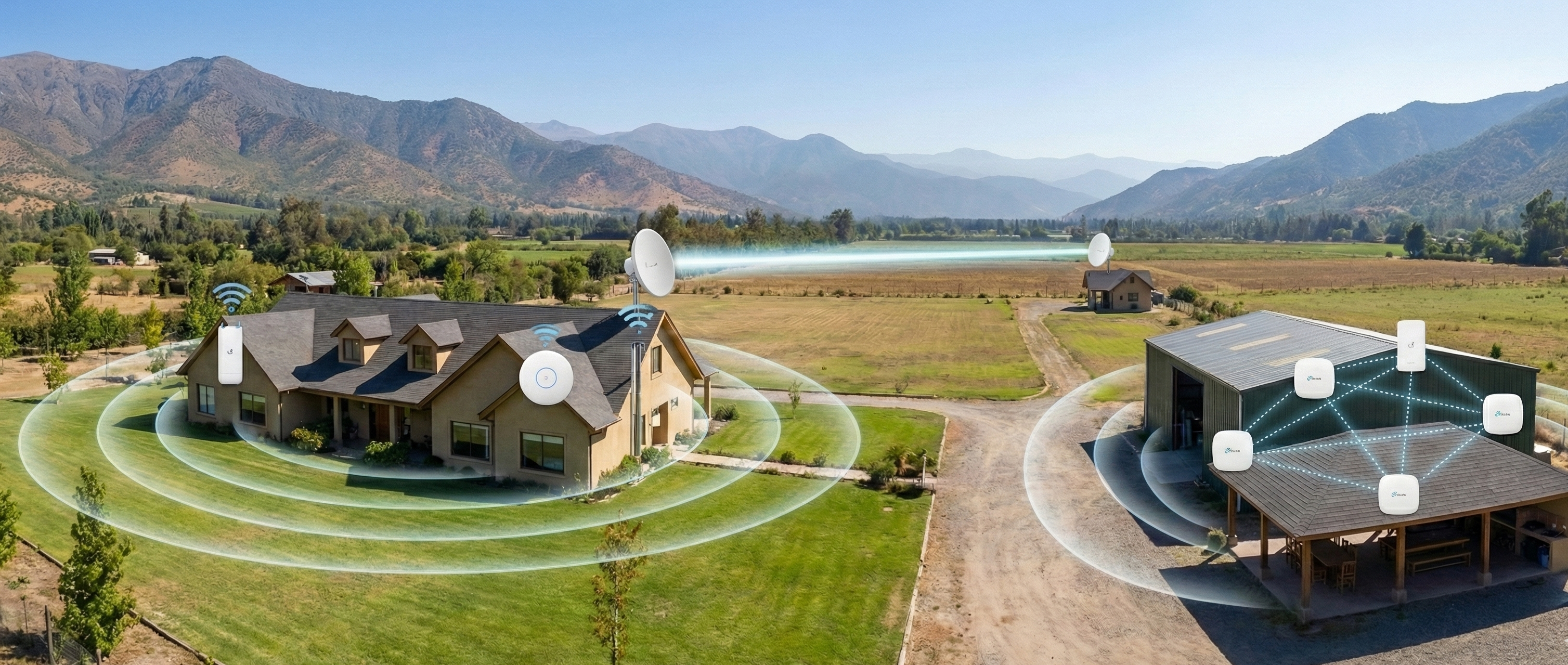 Soluciones WiFi de Alta Cobertura: Diseño de redes inalámbricas para casas grandes, parcelas o bodegas. Eliminamos las "zonas muertas" usando tecnología Mesh y Access Points empresariales (Ubiquiti/TP-Link). Enlaces Inalámbricos Punto a Punto: Conexión de internet entre estructuras distantes (ej: llevar internet de la casa a la caseta del guardia o quincho) mediante antenas de largo alcance.