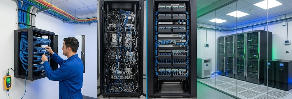 Cableado Estructurado Certificado: Tendido de puntos de red (voz y datos) categorías 6 y 6A. Organización de cableado, peinado de racks y certificación de puntos para oficinas y edificios. Ordenamiento y Montaje de Racks: Saneamiento de gabinetes de comunicaciones desordenados. Identificación, rotulado y orden para evitar fallas críticas. Habilitación de Salas de Servidores: Instalación física de servidores, sistemas de respaldo de energía (UPS) y climatización básica para infraestructura crítica.